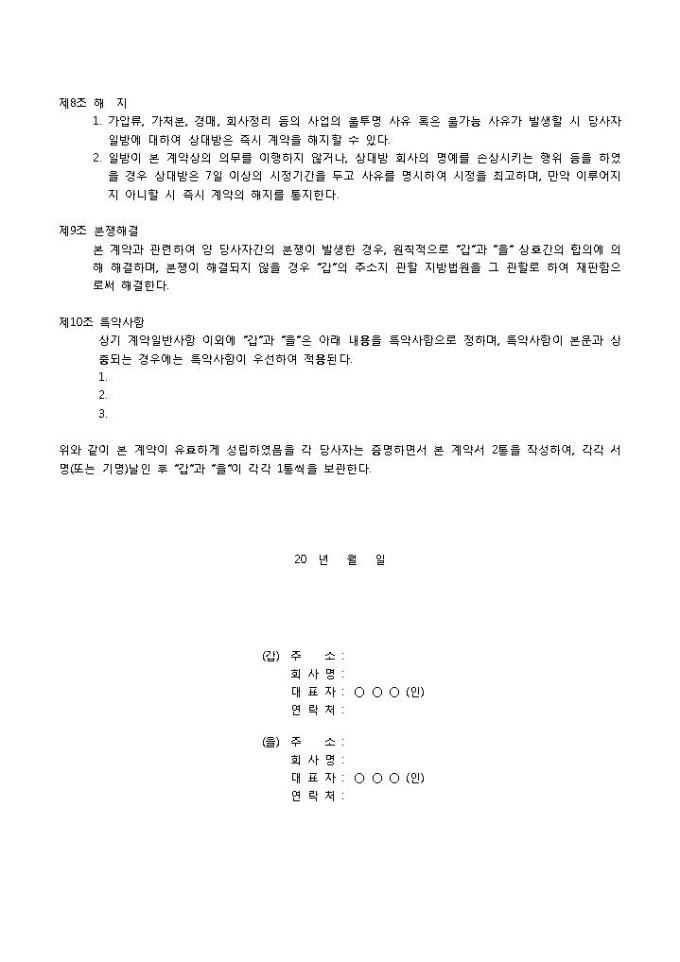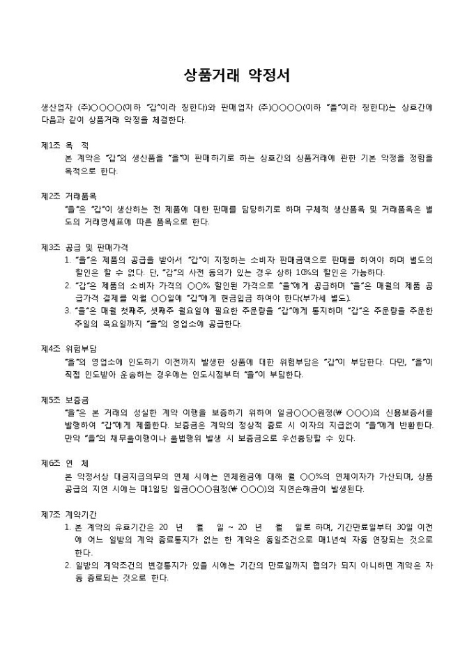 9,000원/월상품거래약정서 입니다. 목적, 거래품목, 공급 및 판매가격, 위험부담 등으로 구성되었습니다. 10개의 조항으로 구성되었으며, 특약사항을 통해 본 계약서에 명시되지 않은 사항을 추가로 기입할 수 있습니다.