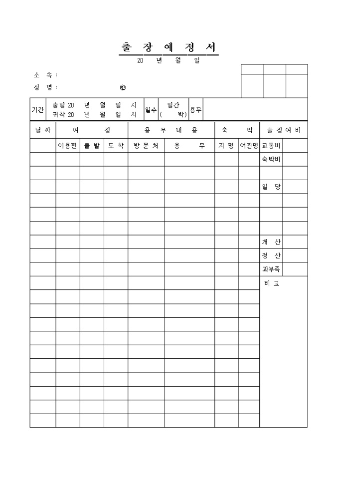 9,000원/월여정, 용무내용, 수박, 여비로 구성된 출장예정서 양식입니다.