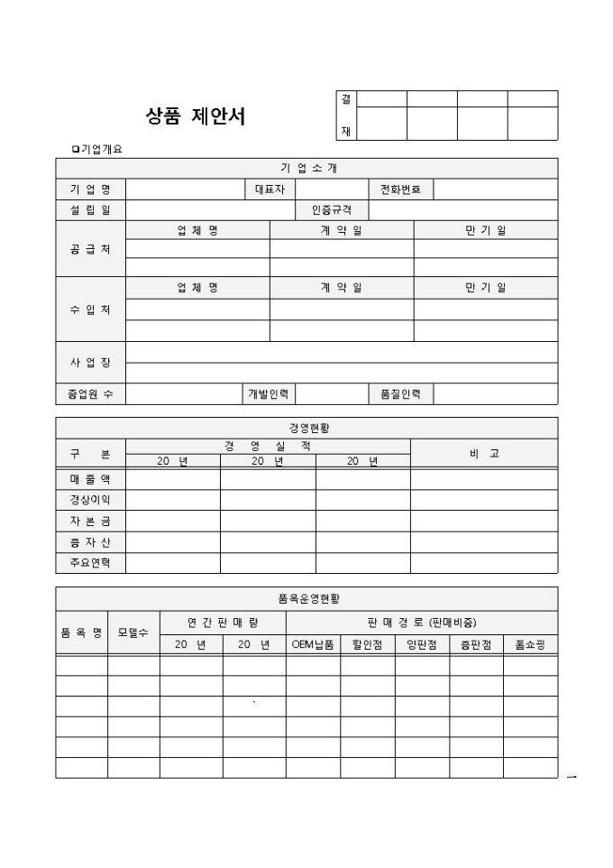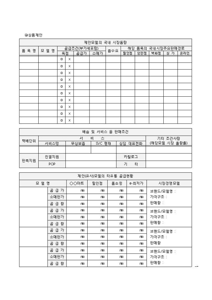 9,000원/월상품제안서 양식입니다. 기업개요, 상품제안, 상세사항으로 구성되어 있습니다. 상품을 제안하는 연유에 대하여 구체적으로 기입할 수 있습니다.