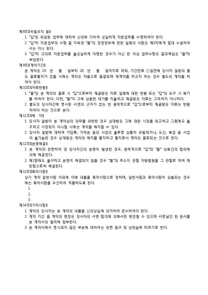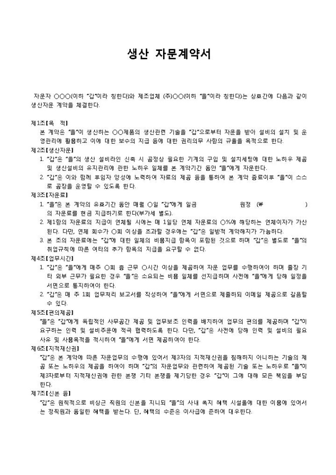 9,000원/월생산 자문계약서입니다. 생산에 대한 자문 내용으로 구성되어 있습니다. 자문자와 제조업체 주식회사가 상호간에 생산 자문에 대한 계약을 체결할 때 작성하여 사용할 수 있습니다.