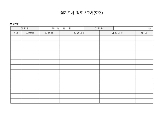 9,000원/월설계도서검토보고서(도면)입니다. 검토일, 분야, 도면번호, 도면명 등의 항목으로 구성되어 있습니다. 다수의 설계도면에 대해 검토 후 검토서 작성시 사용할 수 있는 양식입니다.