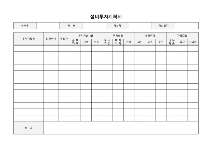 9,000원/월설비투자계획서 입니다. 투자계획명, 담당부서, 담당자, 투자기본내용, 연간이익, 투자효율, 자금조달 등으로 구성되었습니다. 각 항목별 투자계획 작성 및 금액 계산에 용이합니다.
