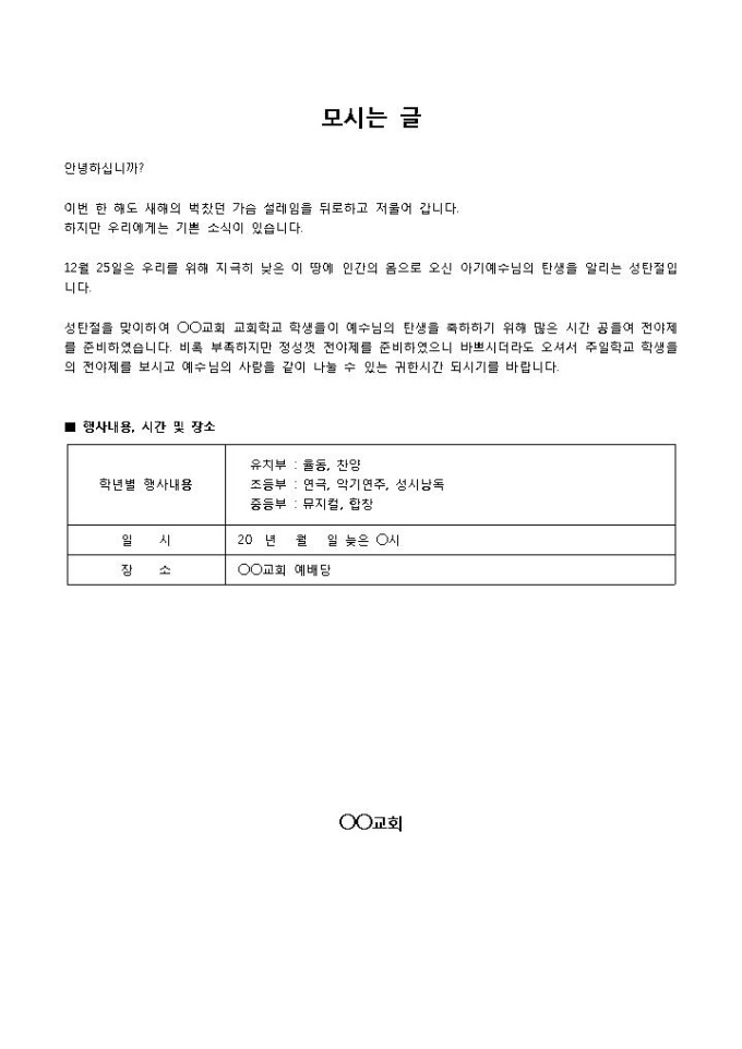 9,000원/월성탄절초대장입니다. 교회에서 성탄절을 맞이 하여 전야제를 준비했음을 알리고 학부모들을 초대하는 내용의 성탄절 초대장 양식입니다.