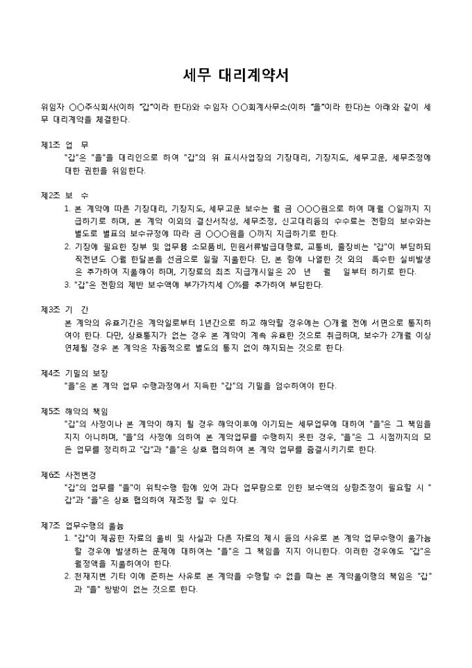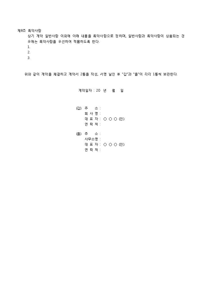 9,000원/월세무대리계약서 입니다. 업무, 보수, 해약의 책임, 사전변경 등 8개의 조항으로 구성되었습니다. 특약사항을 통해 본 계약서에 명시되지 않은 사항을 추가로 기입할 수 있습니다.