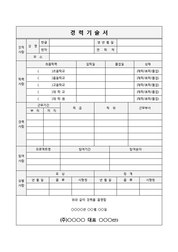 9,000원/월세부경력기술서 입니다. 인적사항, 성명, 주소, 학력사항, 경력사항, 참여사항 등으로 구성되었습니다. 본인의 경력사항을 보다 구체적으로 작성할 수 있으며, 참여프로젝트를 통한 업적 확인에 용이합니다.