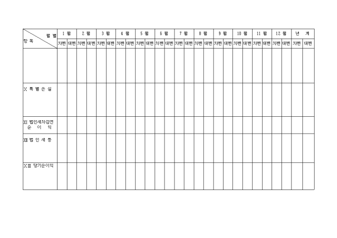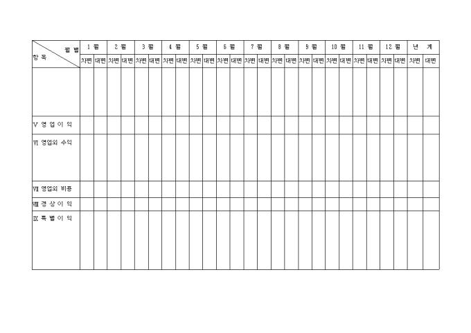 9,000원/월매출액, 매출원가, 매출총이익, 판매비와 일반관리비, 영업이익 등의 항목으로 나누어 손익금을 기록하는 월별손익계산서입니다.