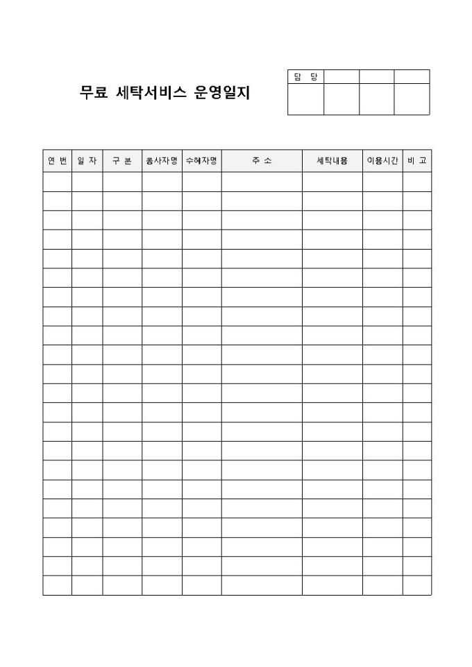 9,000원/월세탁서비스운영일지입니다. 연번, 일자, 구분, 봉사자명, 수혜자명 등의 항목으로 구성되어 있습니다. 사회 복지시설에서 무료 세탁 서비스 제공시 제공 내역에 대해 기입할 수 있는 양식입니다.