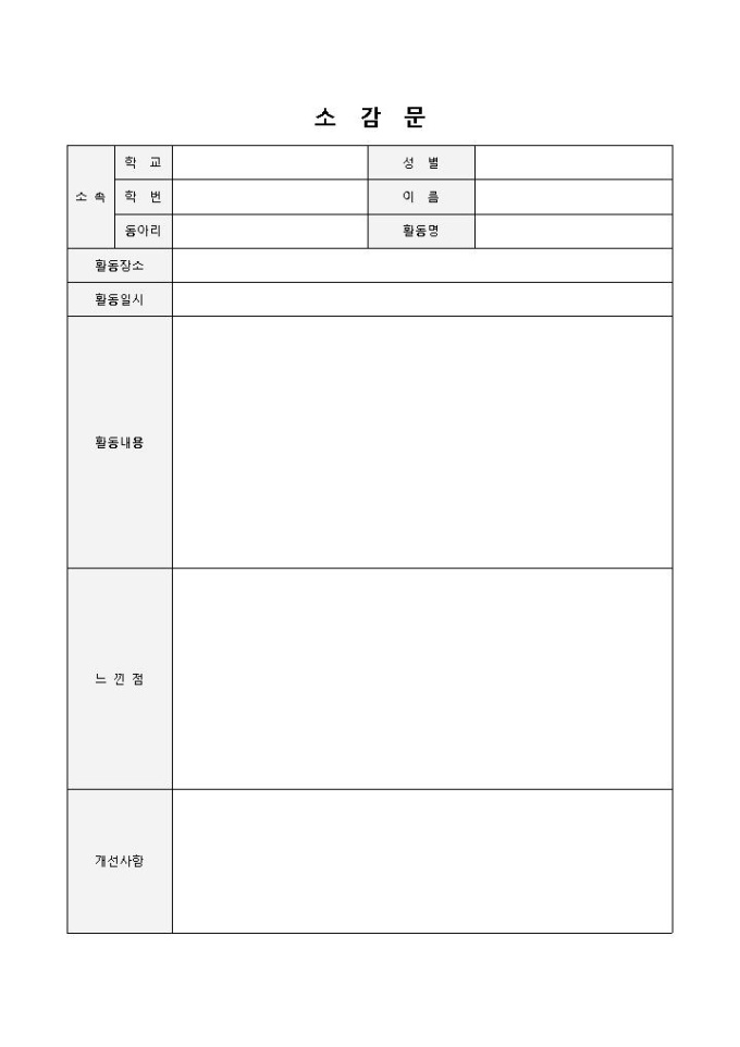 9,000원/월소감문양식 입니다. 소속, 성명, 동아리, 활동일자, 활동명, 활동내용, 느낀점, 개선사항 등으로 구성되었습니다. 작성자의 활동지역 및 활동내용을 간편하게 작성할 수 있습니다. 또한 본인이 활동하면서 느꼈던 소감과 개선사항을 기재할 수 있습니다.