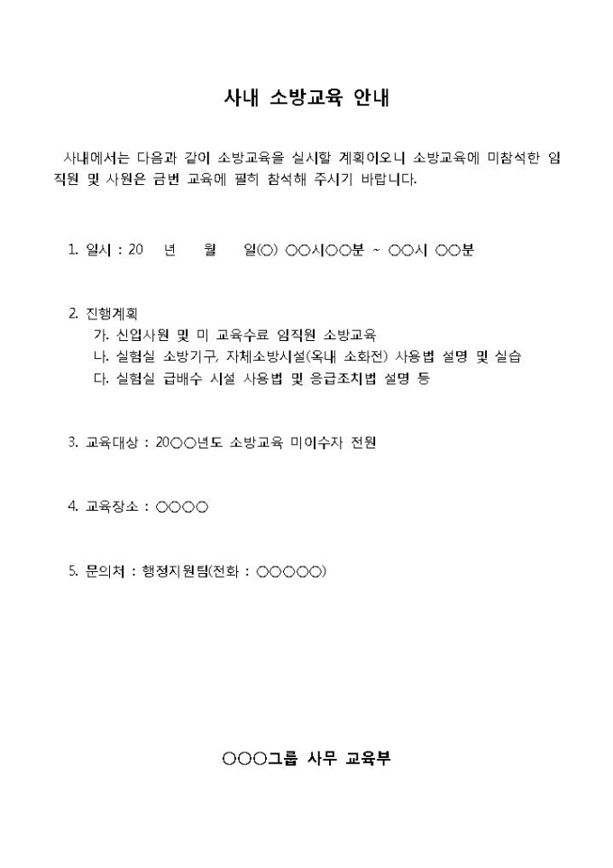 9,000원/월소방교육안내문입니다. 일시, 진행계획, 교육대상 등의 항목으로 구성되어 있습니다. 사내의 소방교육 미참석 직원에게 소방교육의 실시를 알리는 내용의 안내문 양식입니다.