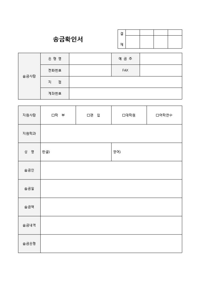 9,000원/월송금확인서 입니다. 은행명, 예금주, 전화번호, 지점, FAX, 계좌번호, 지원학과, 지원사항, 송금액 등으로 구성되었습니다. 송금내역 작성 및 발송내역 확인에 수월한 양식입니다.