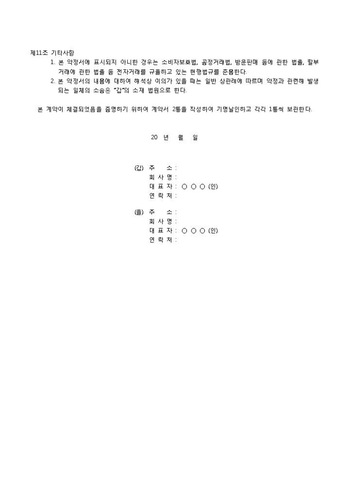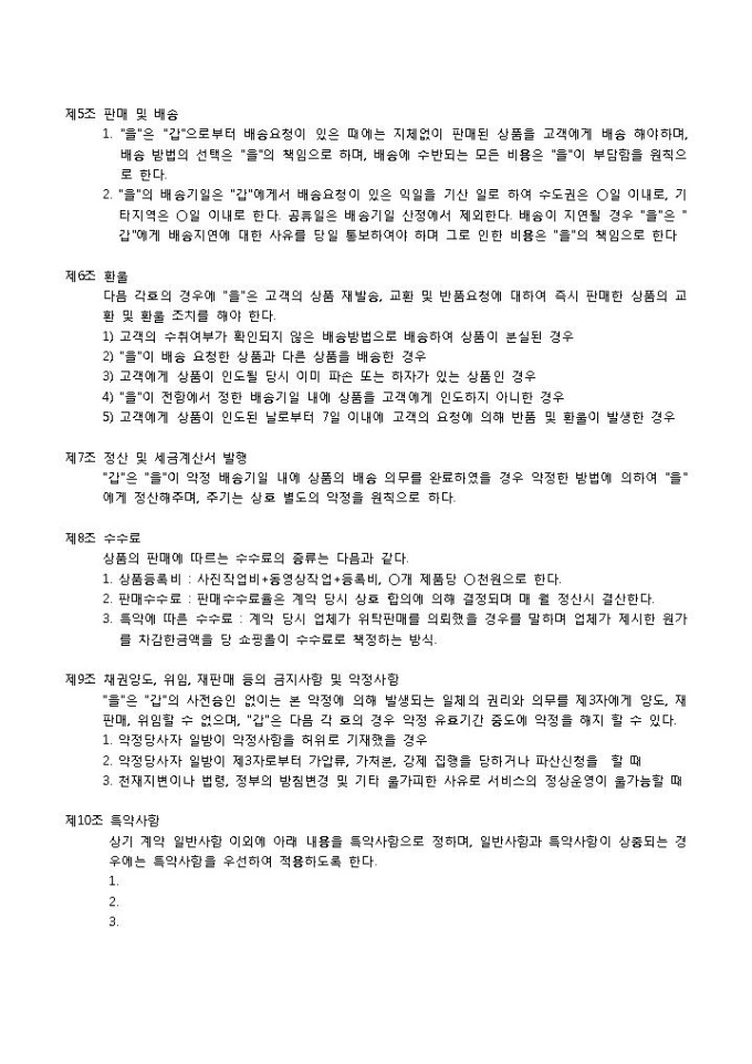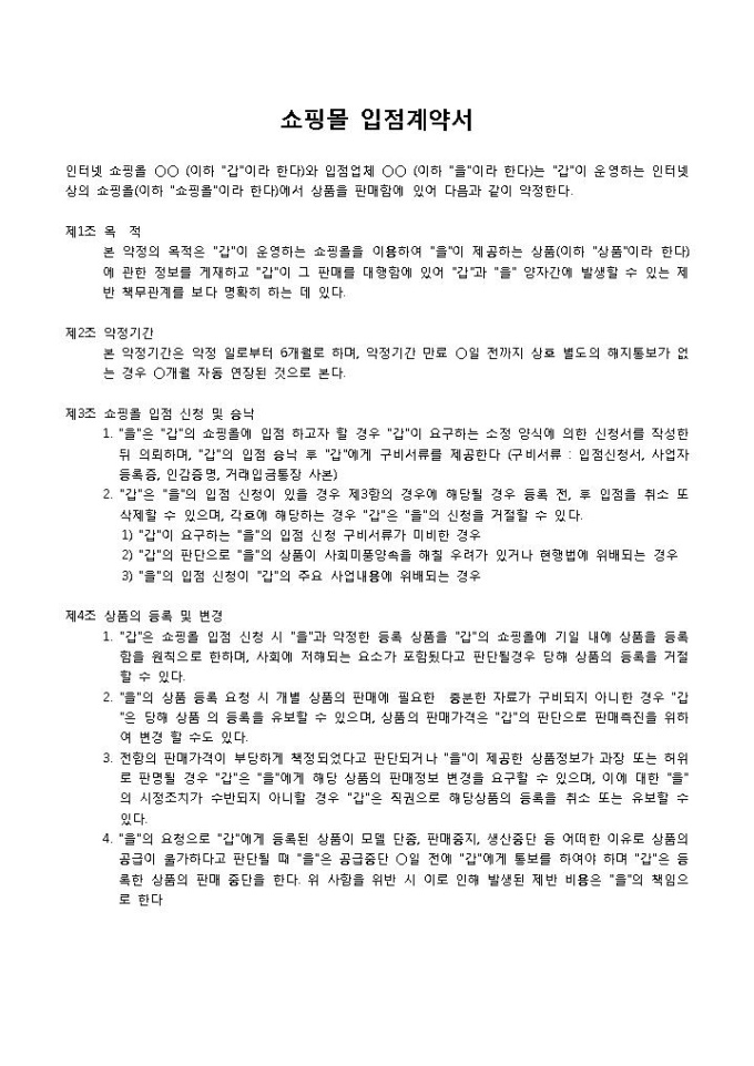 9,000원/월쇼핑몰 입점계약서 입니다. 목적, 약정기간, 쇼핑몰 입점 신청 및 승낙, 상품의 등록 및 변경 등으로 구성되었습니다. 특약사항을 통해 본 계약서에 명시되지 않은 내용을 작성할 수 있습니다.