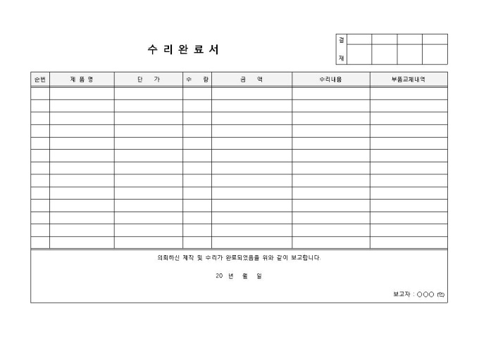 9,000원/월수리완료서 입니다. 제품명, 단가, 수량, 금액, 수리내용 등으로 구성되었습니다. 부품교체내역을 통해 교체내역확인에도 용이합니다.