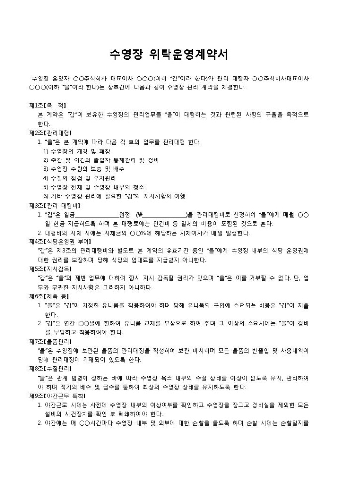 9,000원/월수영장 위탁운영계약서입니다. 위탁 운영 계약 내용으로 구성되어 있습니다. 주영자 운영자 주식회사 대표이사와 관리 대행자 주식회사 대표이사 상호간에 수영장 관리에 대한 계약을 체결할 때 작성하여 사용할 수 있습니다.