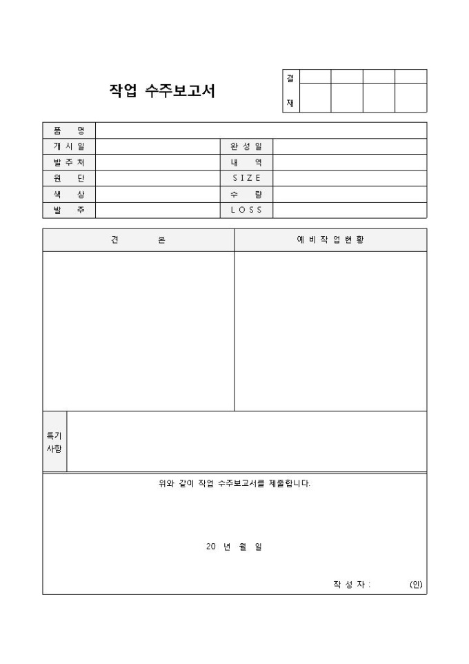 9,000원/월작업 수주보고서 입니다. 품명, 개시일, 발주처, 원단, 색상, 발주 등으로 구성되었으며, 견본 및 예비작업 현황의 내용을 보다 세밀히 기록할 수 있습니다.
