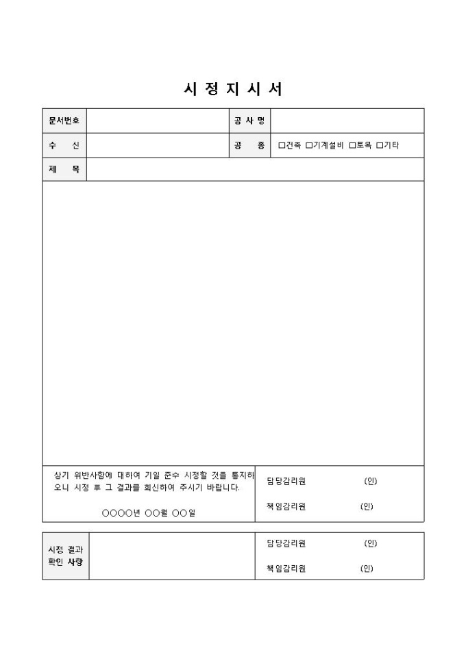 9,000원/월위반사항에 대해 기일 준수 시정할 것을 통지하고 시정 후 그 결과를 회신하기 위해 사용되는 시정지시서 양식입니다. 문서번호, 공사명, 수신, 공종, 제목, 시정 결과 확인 사항 등의 항목으로 구성되어 있습니다.