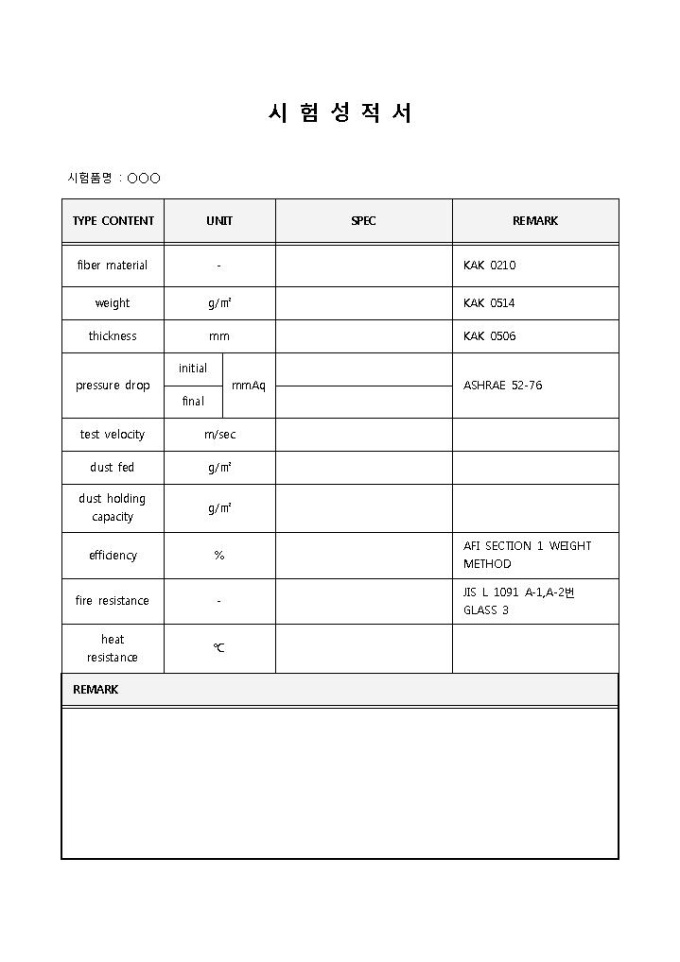 9,000원/월제품을 시험하고 성능을 검사하기 위해 사용되는 시험성적서 양식입니다. 시험품명, TYPE CONTENT, UNIT, SPEC, REMARK 등의 항목으로 구성되어 있습니다.
