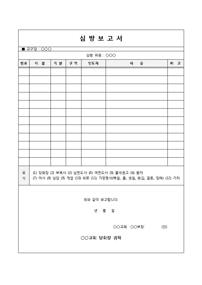 9,000원/월구역별로 구성된 교인들의 가정에 심방 시 사용하는 심방 보고서 양식입니다. 교구장, 심방위원, 이름, 직분, 구역, 인도자, 사유 등의 항목으로 구성되어 있습니다.