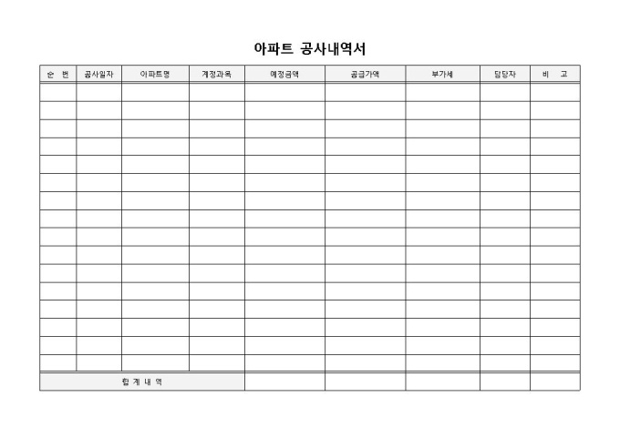 9,000원/월아파트공사내역서 입니다. 순번, 아파트명, 계정과목, 공사일자 등으로 구성되었습니다. 물품의 금액을 계산하고 총액 파악에 용이합니다.