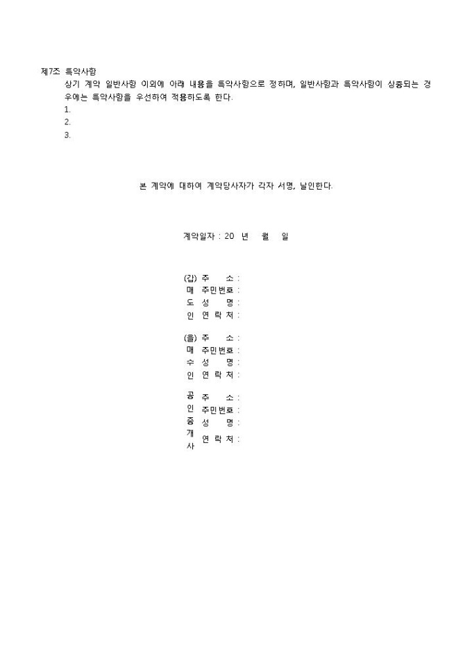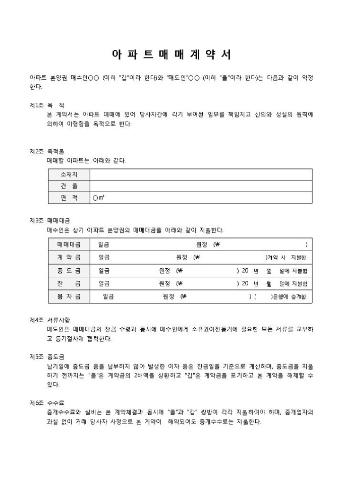 9,000원/월아파트매매계약서 입니다. 목적, 목적물, 매매대금, 서류사항 등으로 구성되었습니다. 특약사항을 통해 본 계약서에 명시되지 않은 사항을 추가로 기입할 수 있습니다.