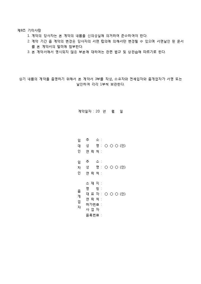 9,000원/월아파트 전세계약서 양식 입니다. 내용물, 지불금액, 명도시기 및 임대기간, 계약위반 등 8개의 조항으로 구성되었습니다. 특약사항을 통해 본 계약서에 명시되지않은 사항을 추가로 기입할 수 있습니다.