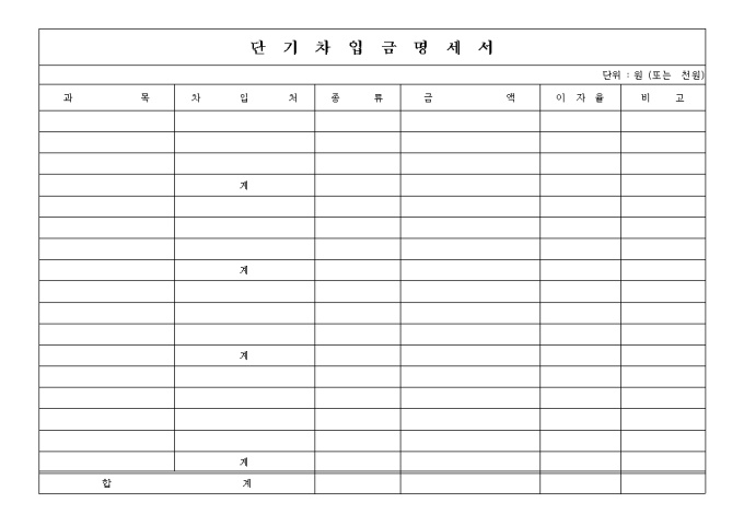 9,000원/월단기차입금명세서 양식입니다. 과목별 차입처, 종류, 금액, 이자율등의 항목으로 구성된 명세서 양식입니다.