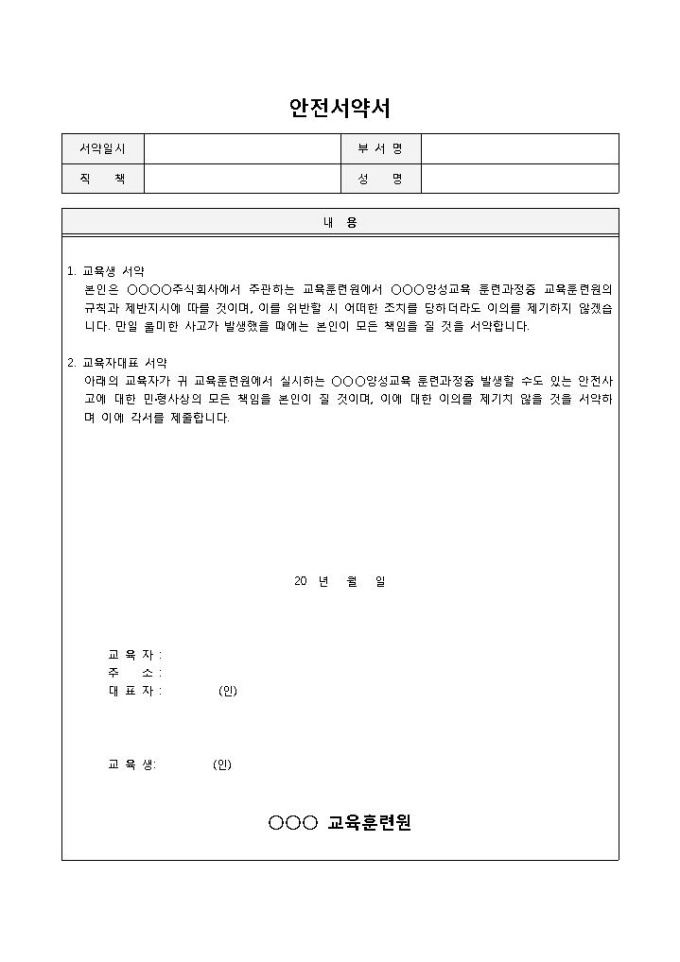 9,000원/월교육훈련 안전서약서 입니다. 서약일시, 부서명, 직책, 성명 등으로 구성되었습니다. 안전 서약 작성이 보다 손쉬운 양식이며, 필요시 내용의 첨삭이 용이합니다.