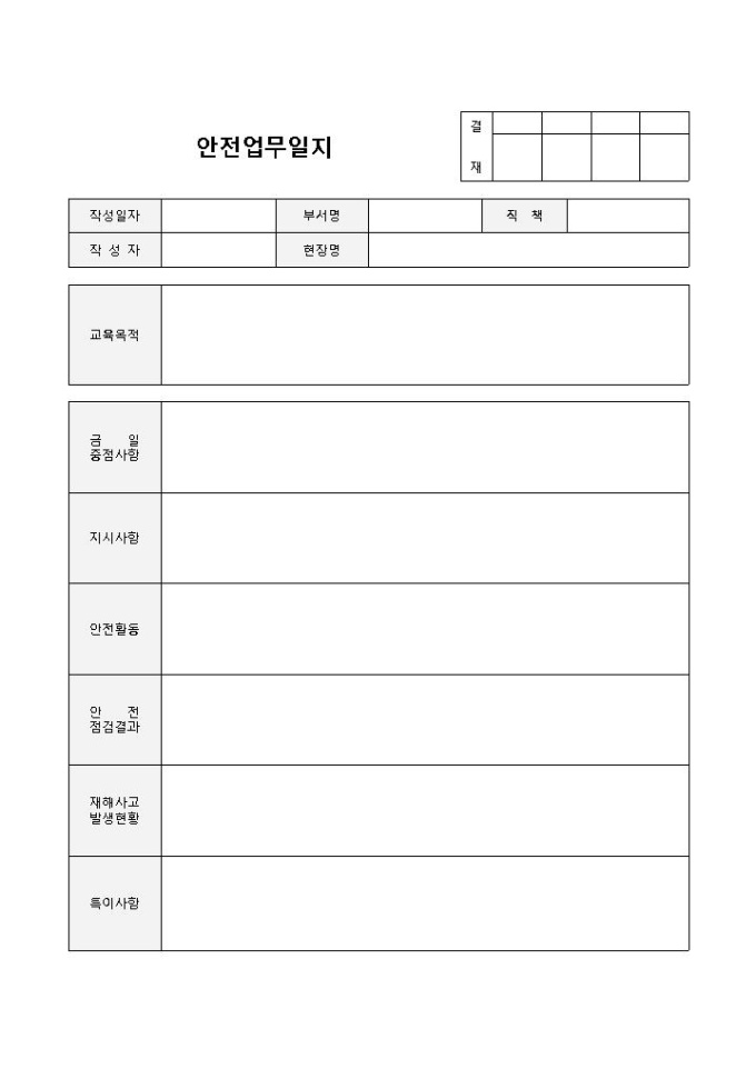 9,000원/월안전업무일지 입니다. 작성일자, 부서명, 직책, 성명, 현장명, 교육목적 등으로 구성되었습니다. 금일의 중점사항 및 교육내용을 작성하고 업무 중 발생한 특이사항을 기록하는데 뛰어난 양식입니다.