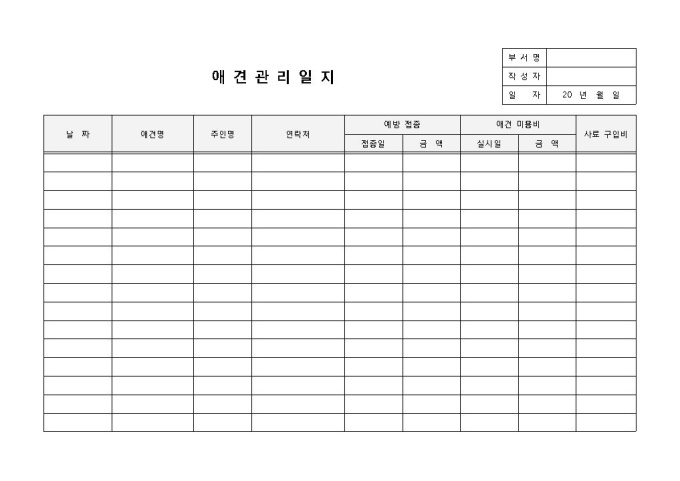 9,000원/월애견병원 관리리스트 입니다. 날짜, 애견명, 주인명, 연락처, 일시, 예방접종일, 예견미용비 등으로 구성되었으며, 실시일 확인 및 금액 계산에 용이한 양식입니다.
