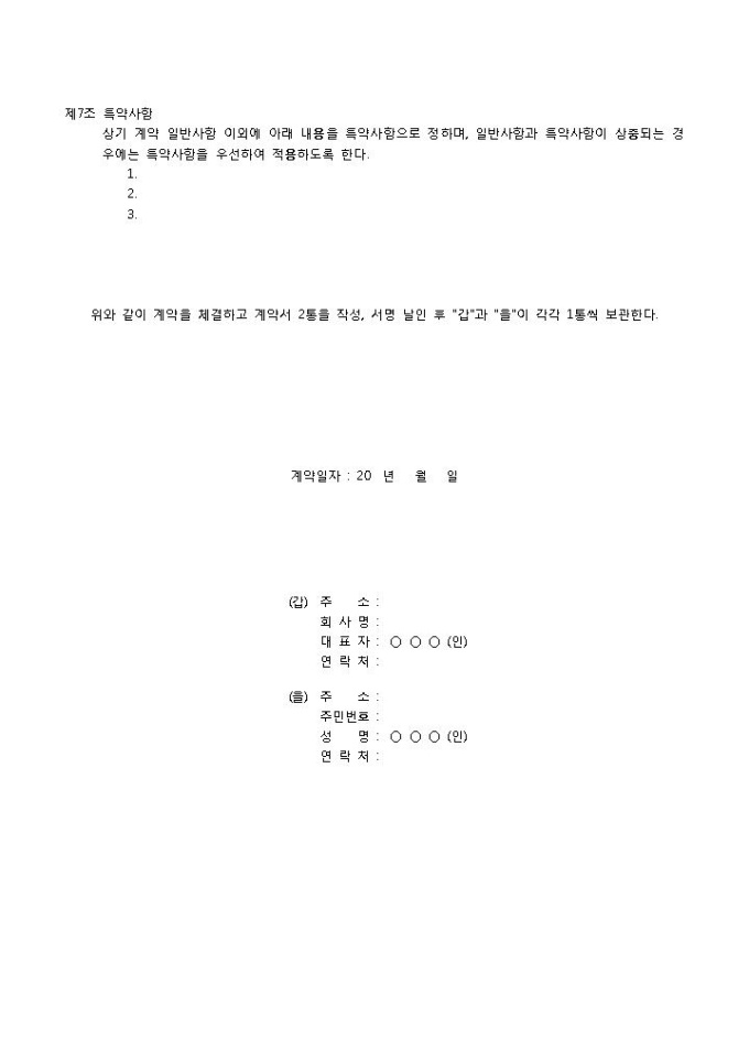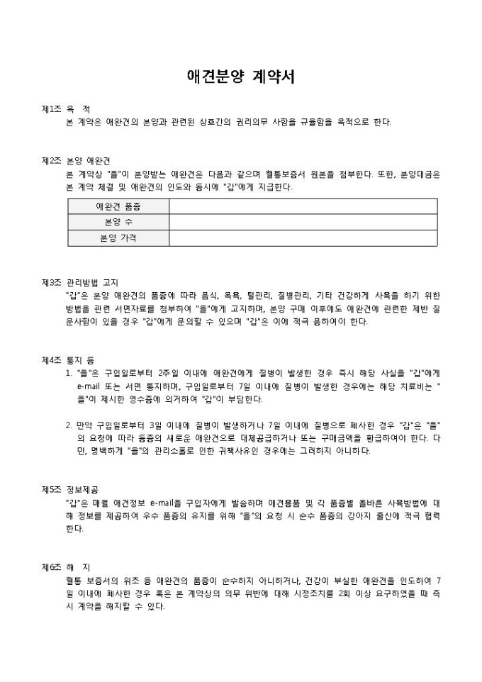 9,000원/월애견분양계약서 입니다. 목적, 분양애완견, 관리방법 고지 등 7개의 항목으로 구성되었으며, 특약사항을 통해 명시되지 않은사항을 추가로 기입할 수 있습니다.