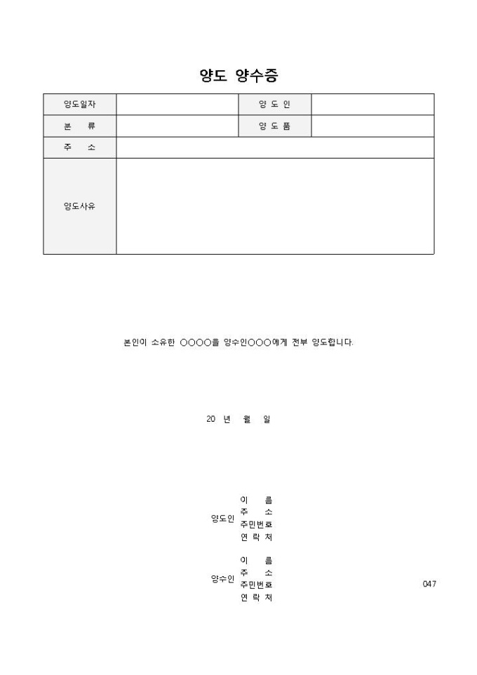 9,000원/월양도양수증 입니다. 양도인, 주소, 주민등록번호, 양도품으로 구성되었습니다. 양도하고자 하는 물품의 세부사항 및 양도사유 작성이 손쉬운 양식입니다.