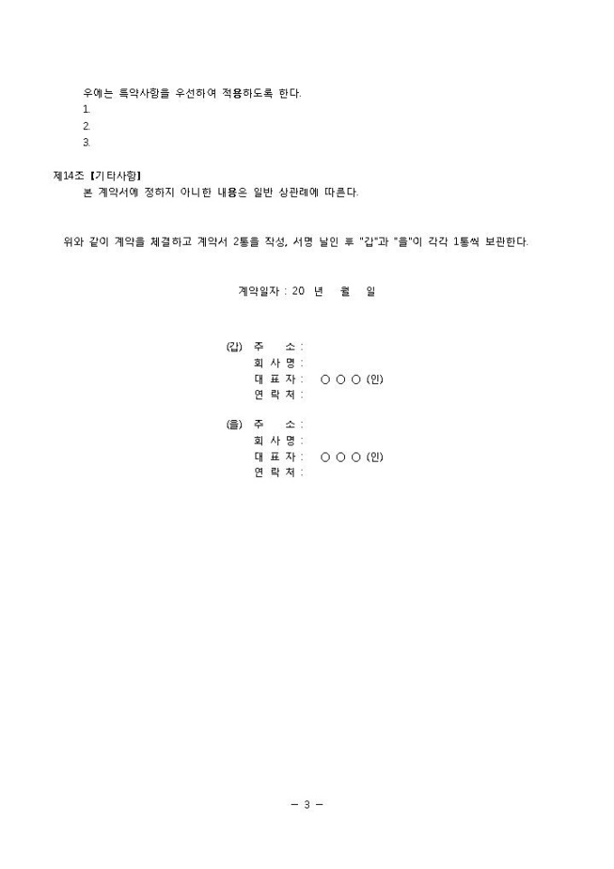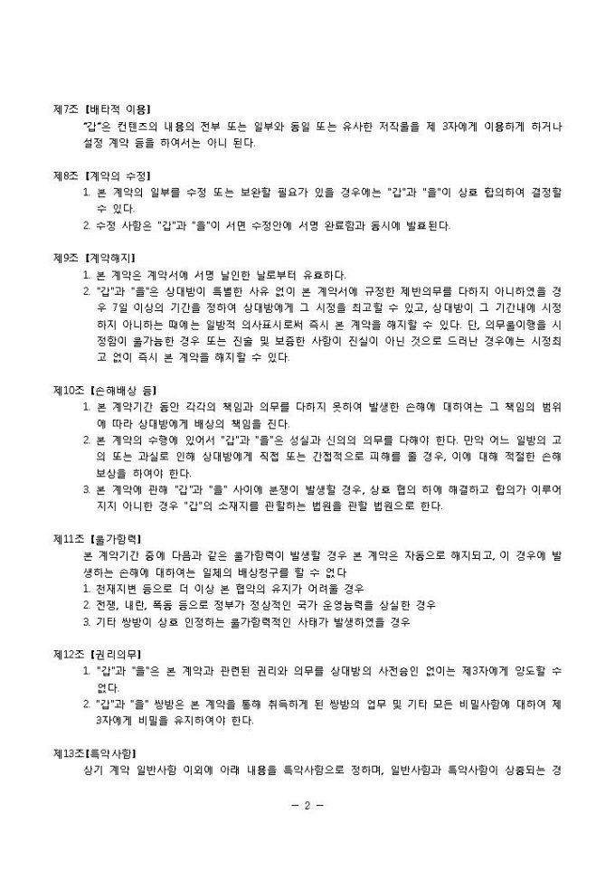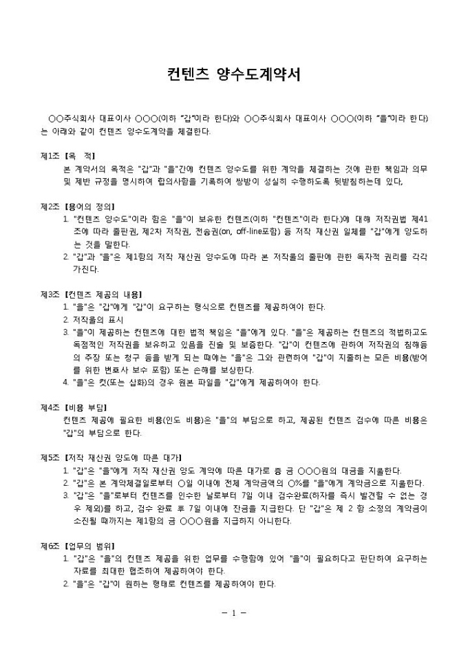 9,000원/월양수도계약서(컨텐츠)입니다. 목적, 용어의 정의, 컨텐츠 제공의 내용, 비용 부담 등의 항목으로 구성되어 있습니다. 총 13조항으로 구성되어 있으며 제 12조 특약사항을 포함하여 상황에 맞게 기입하여 사용할 수 있습니다. 회사와 회사사이에서 갑에게 저작 재산권 일체를 양도한다는 내용의 계약서 양식입니다.