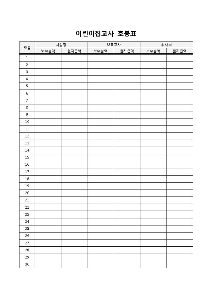 9,000원/월어린이집교사호봉표 양식입니다. 시설장, 보육교사, 취사부 등으로 구성되었습니다. 각 항목별 호봉에 따른 금액 작성 및 파악이 용이한 양식입니다.