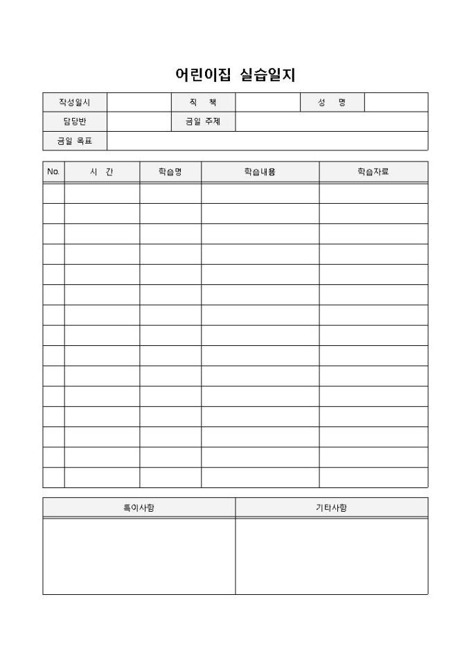 9,000원/월어린이집 실습일지 입니다. 작성일시, 직책, 성명, 금일주제, 시간, 학습명, 학습내용 등으로 구성되었습니다. 실습목표 및 학습내용을 기록하고 그와 관련된 특이사항 및 문제점 보고에 효과적입니다.