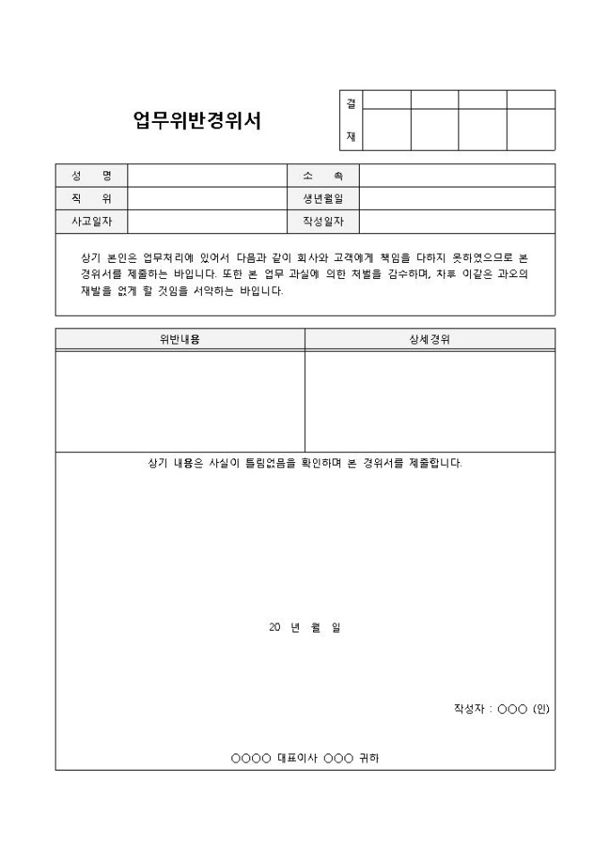 업무 위반 경위서 입니다. 성명, 직위, 사고일자, 소속, 생년월일, 작성일자 등으로 구성되었습니다. 위반내용 및 그에 따른 상세경위를 보다 구체적으로 기입할 수 있습니다.