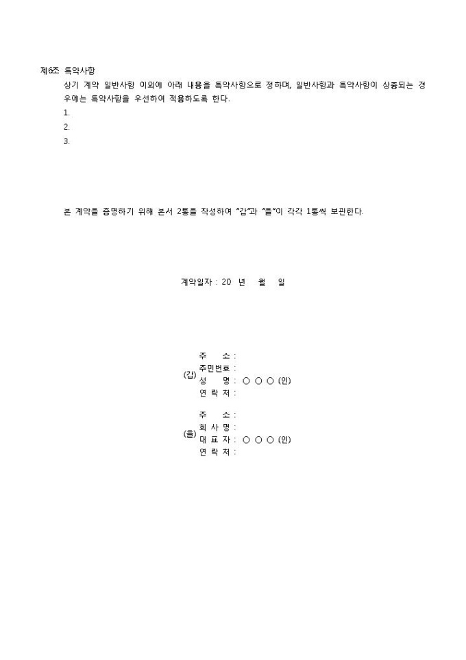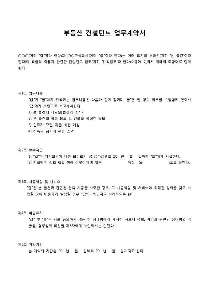 9,000원/월부동산 컨설턴트 업무계약서 입니다. 업무내용, 보수지급, 시공책임 및 서비스, 비밀유지, 계약기간 등으로 구성되었습니다. 특약사항을 통해 본 계약서에 명시되지 않은 사항을 추가로 기입할 수 있습니다.