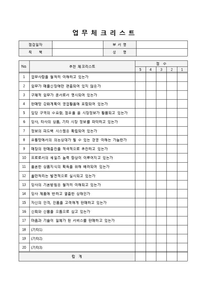 9,000원/월업무체크리스트 입니다. 점검일자, 부서명, 성명, 추천 체크리스트, 점수 등으로 구성되었습니다. 평가사항을 작성하고 그에 대한 점수 채점 및 업무능력 점검에 용이한 양식입니다.