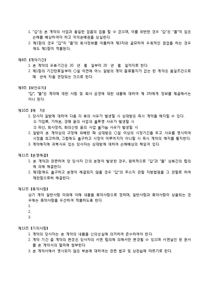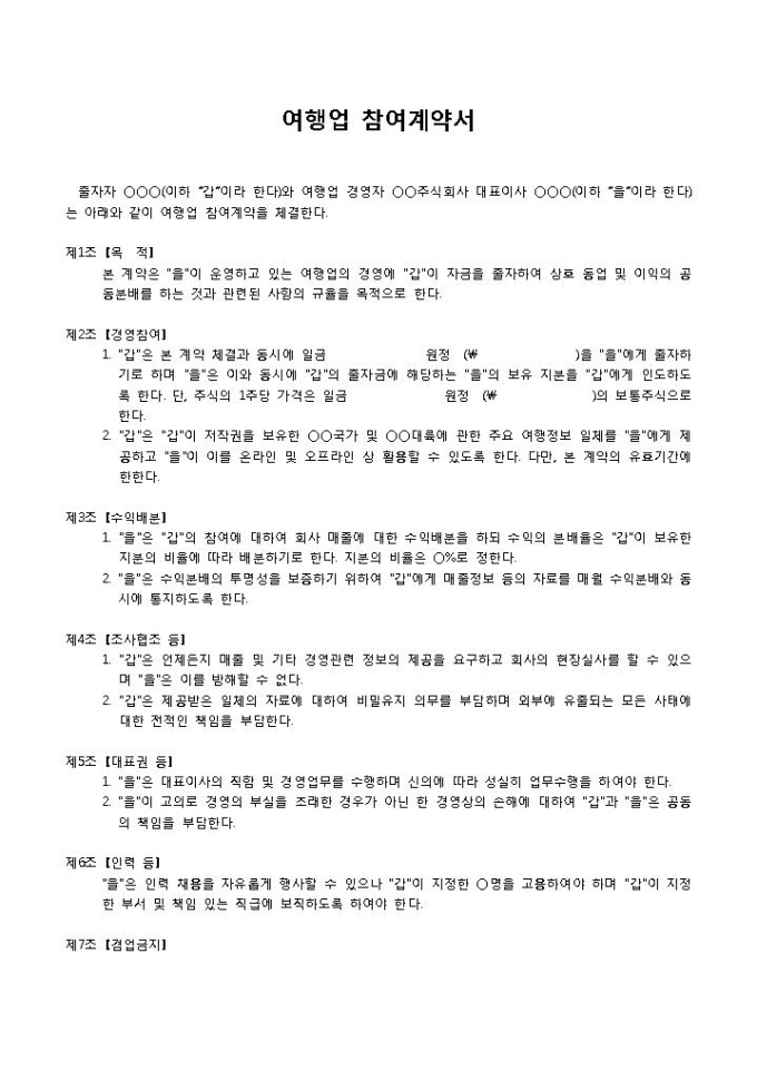 9,000원/월여행업계약서(참여)입니다. 목적, 경영참여, 수익배분, 조사협조 등, 대표권 등의 항목으로 구성되어 있습니다. 총 13조항으로 구성되어 있으며 제 12조 특약사항을 포함하여 상황에 맞게 기입하여 사용할 수 있습니다. 여행업에 참여하는 출자자 갑과 여행업 경영자 을 사이에서 갑이 여행업에 참여하는 계약을 맺을 경우 사용할 수 있는 양식입니다.