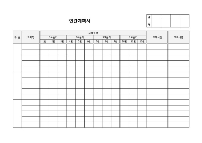 9,000원/월연간계획서 입니다. 구분, 교육명, 교육시간, 교육일정, 교육비용 등으로 구성되었습니다. 분기별 혹은 월별 교육일수 계획에 용이합니다.