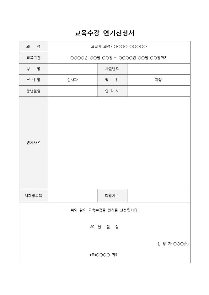 9,000원/월교육수강 연기신청서 입니다. 과정, 교육기간, 성명, 부서명 등으로 구성되었으며, 연기사유를 구체적으로 기술할 수 있습니다.