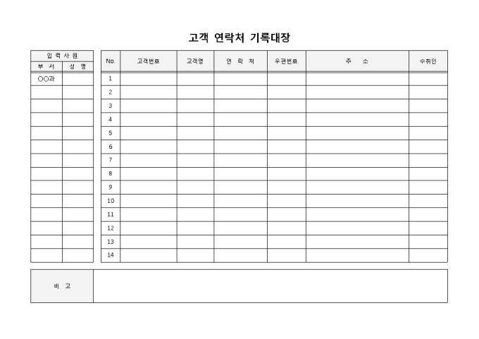 9,000원/월연락처서식 입니다. 입력사원, 고객번호, 연락처 등으로 구성되었으며, 비고란을 통하여 특이사항 기록에도 용이합니다.