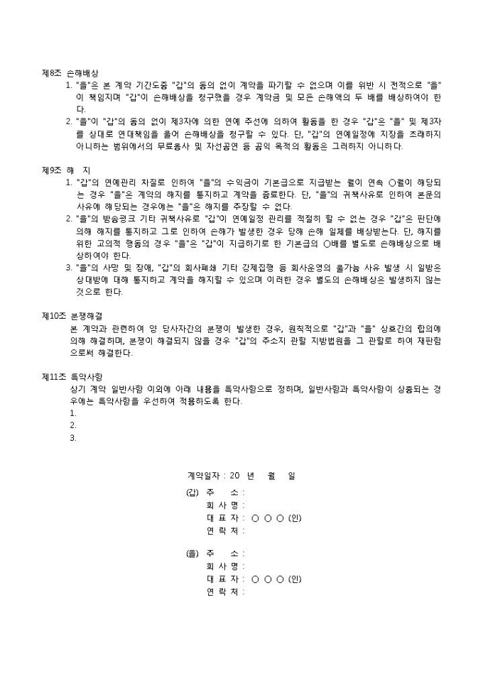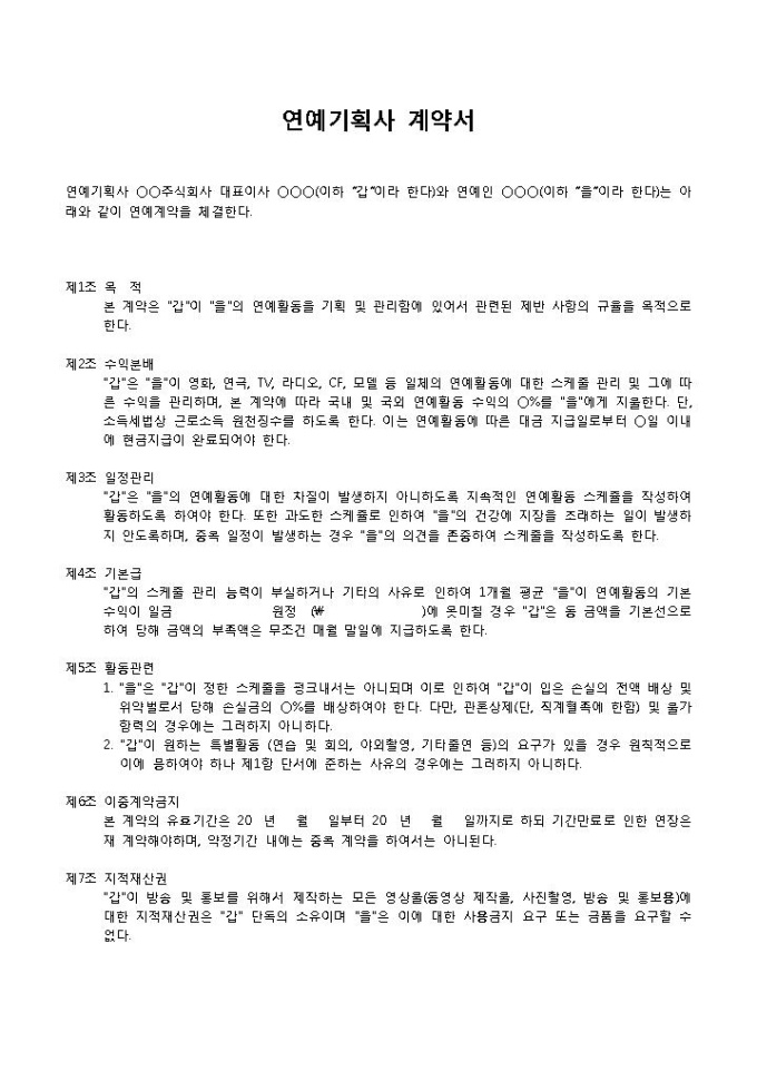 9,000원/월연예기획사계약서 입니다. 목적, 수입분배, 기본급 등 11개 조항으로 구성되었습니다. 특약사항을 통해 본 계약서에 명시되지않은 사항을 추가로 기입할 수 있습니다.