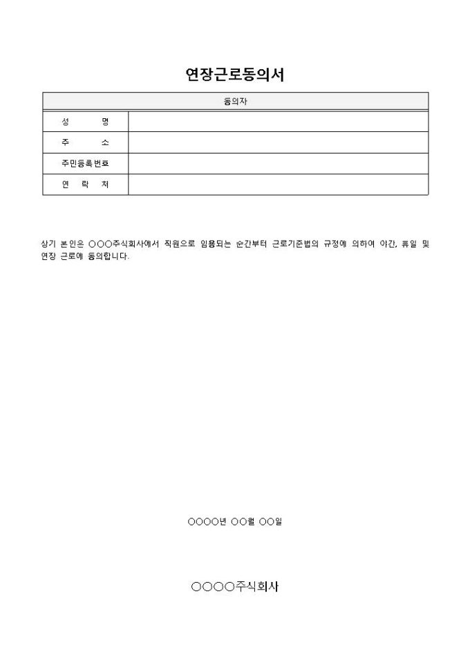 9,000원/월연장근로동의서 입니다. 회사의 업무규정에 따른 연장근로 시행에 동의하는 내용이 포함된 양식입니다.
