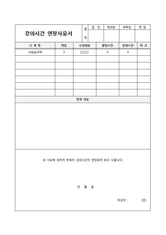 9,000원/월강의시간의 연장을 허락받기 위해 사용되는 연장 사유서 양식입니다. 결재라인과 함께 과목명, 학점, 수강대상, 할당시간, 연장시간, 사유 등의 항목으로 구성되어 있습니다.