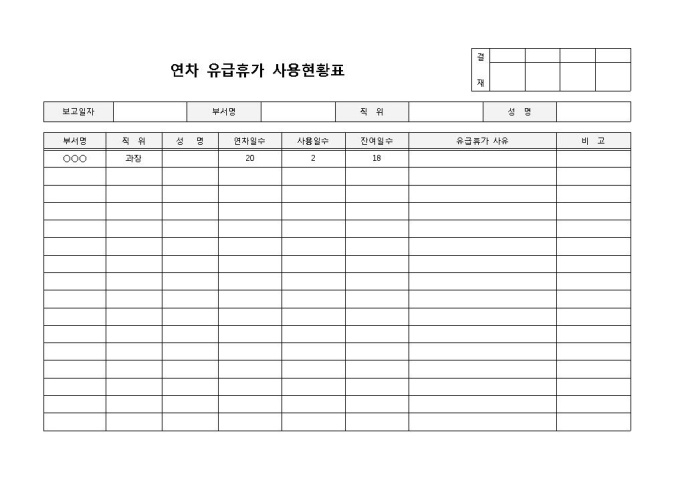 9,000원/월연차유급휴가 입니다. 보고일자, 직위, 성명, 연차일수, 사용일수, 잔여일수 등으로 구성되었으며, 유급휴가 사유 등을 통해 세부적인 사항까지 기입할 수 있습니다.