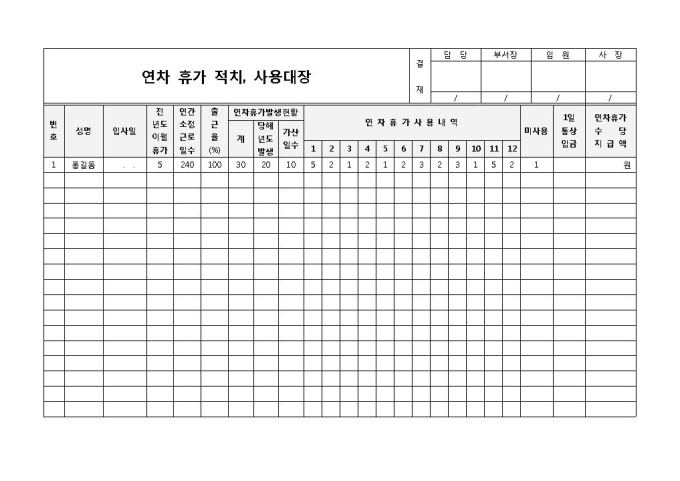 9,000원/월연차 휴가의 년단위의 사용내역이나 연차 발생내역을 관리 및 기록할 때 사용하는 연차 휴가 적치, 사용대장 양식입니다. 결재라인과 함께 성명, 입사일, 전년도 이월휴가, 연간 소정근로일수, 출근율, 연차 발생현황 및 사용내역 등의 항목으로 구성되어 있습니다.