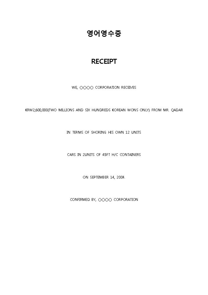 9,000원/월영어영수증입니다. 영어로 되어진 영수증 내용으로 구성되어 있습니다. 물품을 구매하고 이에 대한 영수증으로 영어로 사용하고 할 때 작성하여 사용할 수 있습니다.