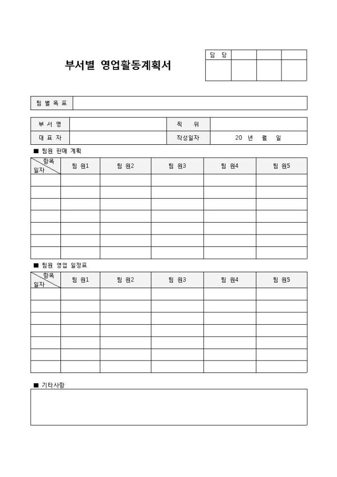 9,000원/월영업활동계획서(부서별)입니다. 팀별목표, 부서명, 직위, 대표자, 팀원판매계획, 팀원영업일정표, 기타사항 등의 항목으로 구성되어 있습니다. 부서별로 영업활동 계획을 세울 경우 사용 할 수 있습니다.