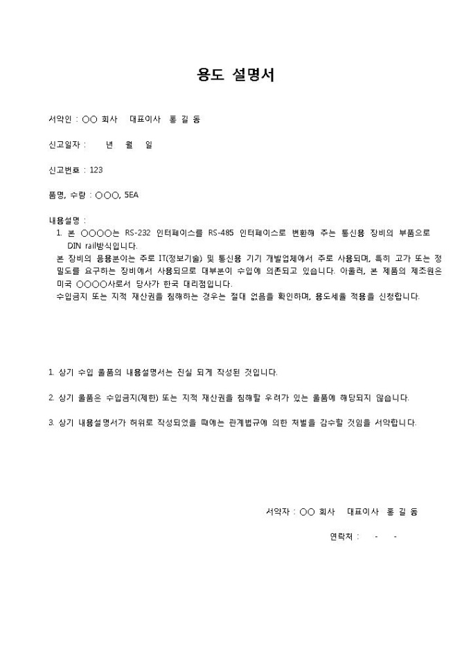 9,000원/월특정 제품 등에 관한 제반 사항을 설명하는 내용의 용도 설명서(예문) 양식입니다. 서약인, 신고일자, 품명, 수량, 내용설명 등의 항목으로 구성되어 있습니다.
