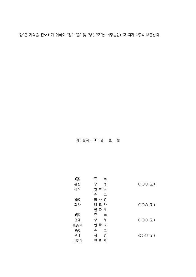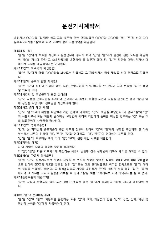 9,000원/월운전기사계약서입니다. 운전기사에 관한 계약 내용으로 구성되어 있습니다. 운전기사와 그의 채무에 관한 연대보증인 운수주식회사와 상호간에 고용에 관한 계약을 체결할 때 작성하여 사용할 수 있습니다.