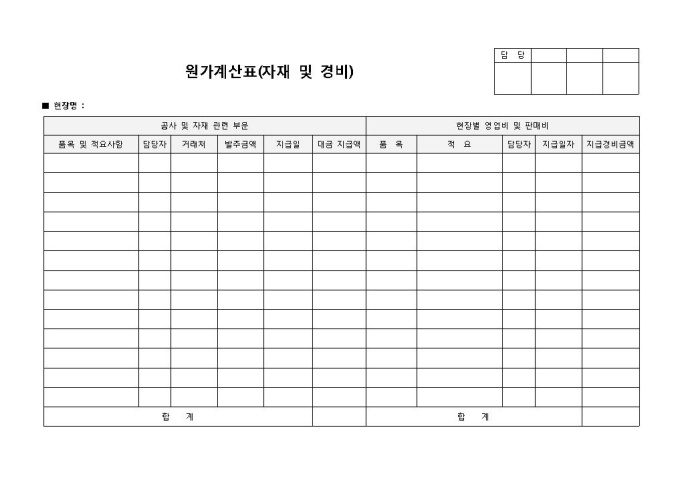 9,000원/월원가계산표(자재및경비)입니다. 공사 및 자재 관련부문, 현장별 영업비, 품목 및 적요사항, 담당자, 거래처, 발주금액, 지급일, 대금지금액 등의 항목으로 구성되어 있습니다. 현장의 자재 및 경비에 대해 원가 계산시 사용할 수 있는 양식입니다.